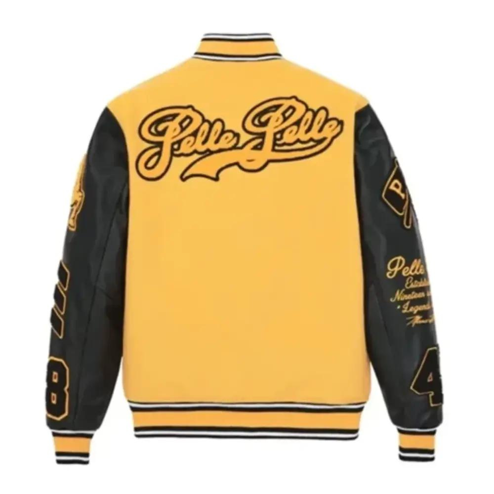Turn heads with the New Pelle Pelle Men’s Varsity Jacket in Black and Gold, crafted from premium leather with bold embroidery, sleek contrast accents, and timeless urban appeal.