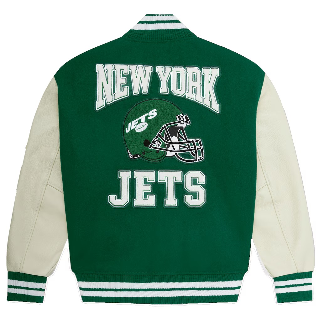Elevate your game-day style with the OVO x NFL New York Jets Varsity Jacket, crafted from premium leather with detailed embroidery, bold Jets branding, and signature OVO design for a luxury streetwear vibe.