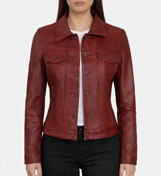Women’s Red Leather Trucker Jacket